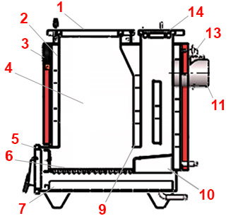 Стальной теплообменник состоит из двух частей: в передней части - камера сгорания, в задней - конвективные каналы. Весь теплообменник охлаждается водой, образуя «водяную рубашку». Вода из системы теплоснабжения растекается по внутренним полостям теплообменника и через его металлические стенки отбирает тепло от топлива горящего (контактным и радиационным способами) и газообразных продуктов сгорания (конвективным способом). Процесс горения происходит на подвижных или неподвижных чугунных колосниках, под колосниками находится зольный ящик. На верхней передней стороне котла размещен люк, на передней стороне люк для удаления золы и шуровки и термометр. На задней стороне находятся: дымоход с шибером, ручка прямой тяги, входящий и исходящий патрубки. Под декоративным кожухом расположен слой теплоизоляции. На левой стороне модели Ретра 6М Комфорт находится ручка механизма шуровки колосников.
