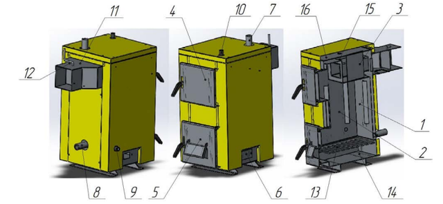1 - Корпус котла; 2 - Камера згоряння; 3 - Теплообмінник; 4 - Завантажувальні дверцята; 5 — Ревізійні дверцята; 6 — Отвір під вентилятор; 7 - Патрубок прямої мережевої води; 8 - Патрубок зворотної мережевої води; 9 - Штуцер зливання води з котла; 10 - Штуцер під запобіжний клапан; 11 - Борів; 12 - Шибер тяги; 13 - Колосникова решітка; 14 - Попелюшник; 15 - Водяна сорочка; 16 — Теплоізоляція корпусу.